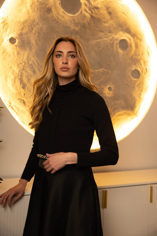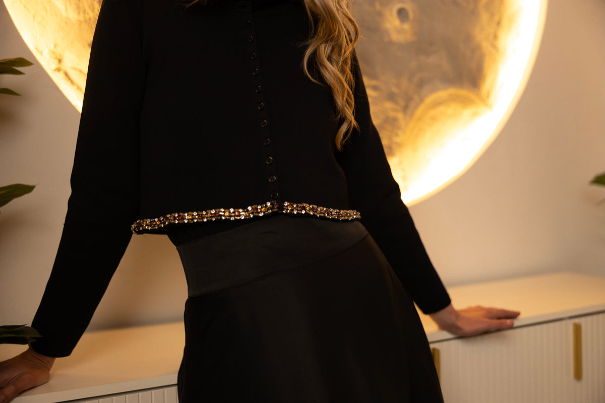 The Shay Knit Cardigan is a cropped style with button-down front and rhinestone detailing along the hem