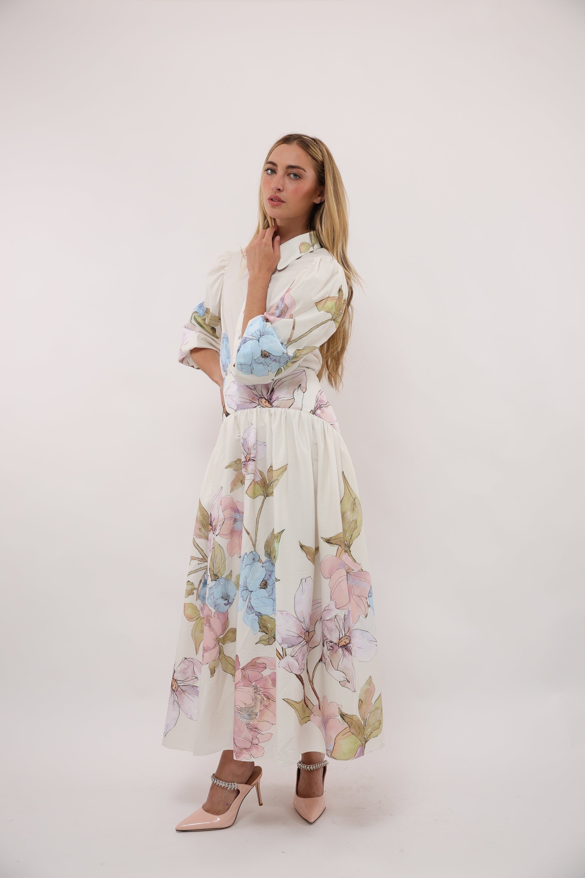 The Violetta Set is an effortlessly elegant ensemble, featuring a collared button-down top with cuff sleeves paired with a flattering waisted skirt