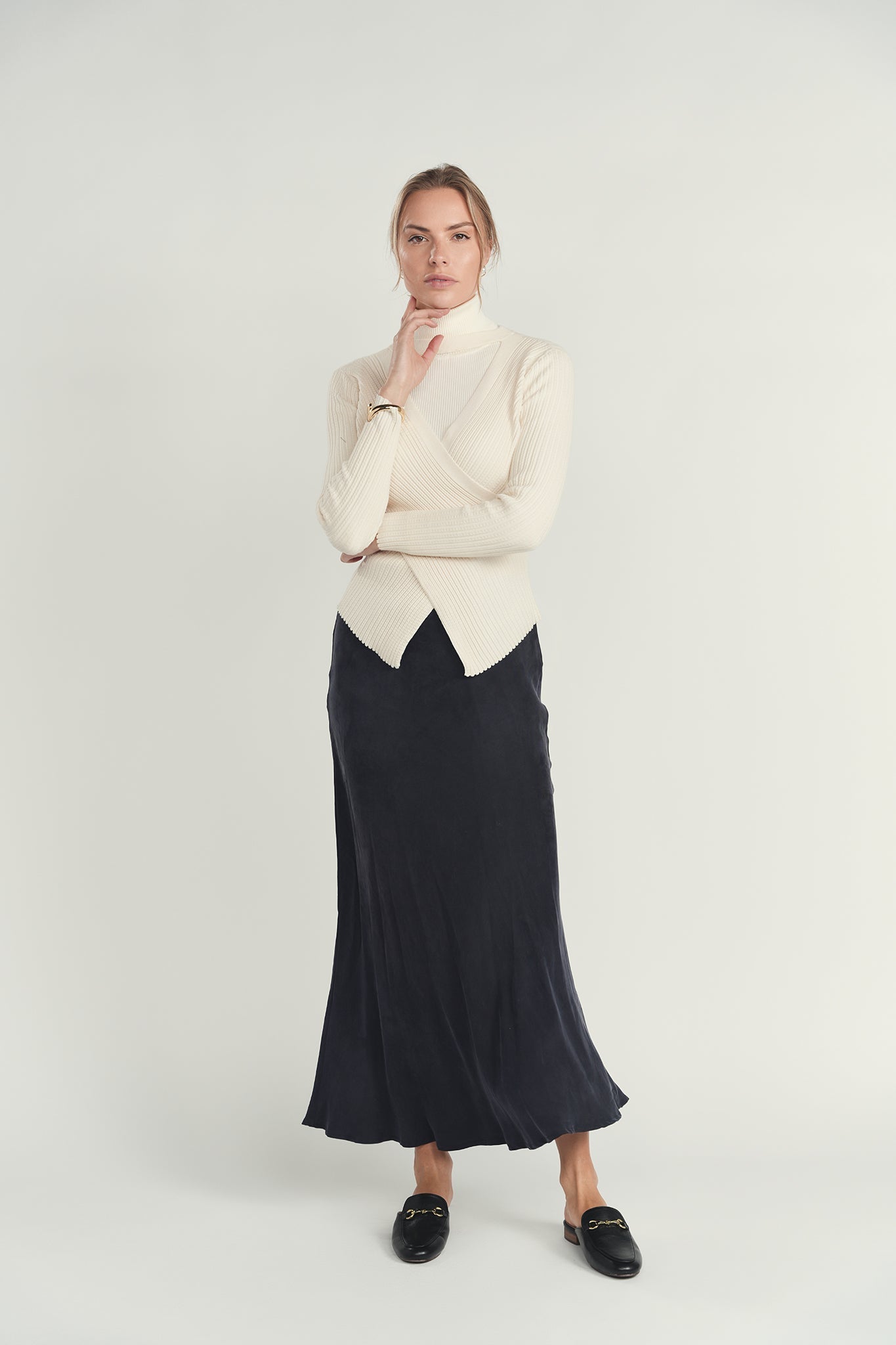 The asymmetrical hem creates subtle movement, while the fitted silhouette makes it ideal for tucking into skirts or tailoring