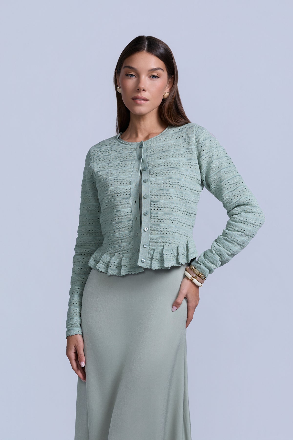 The Pointelle Cardigan is a delicate layering piece designed with a refined, feminine touch