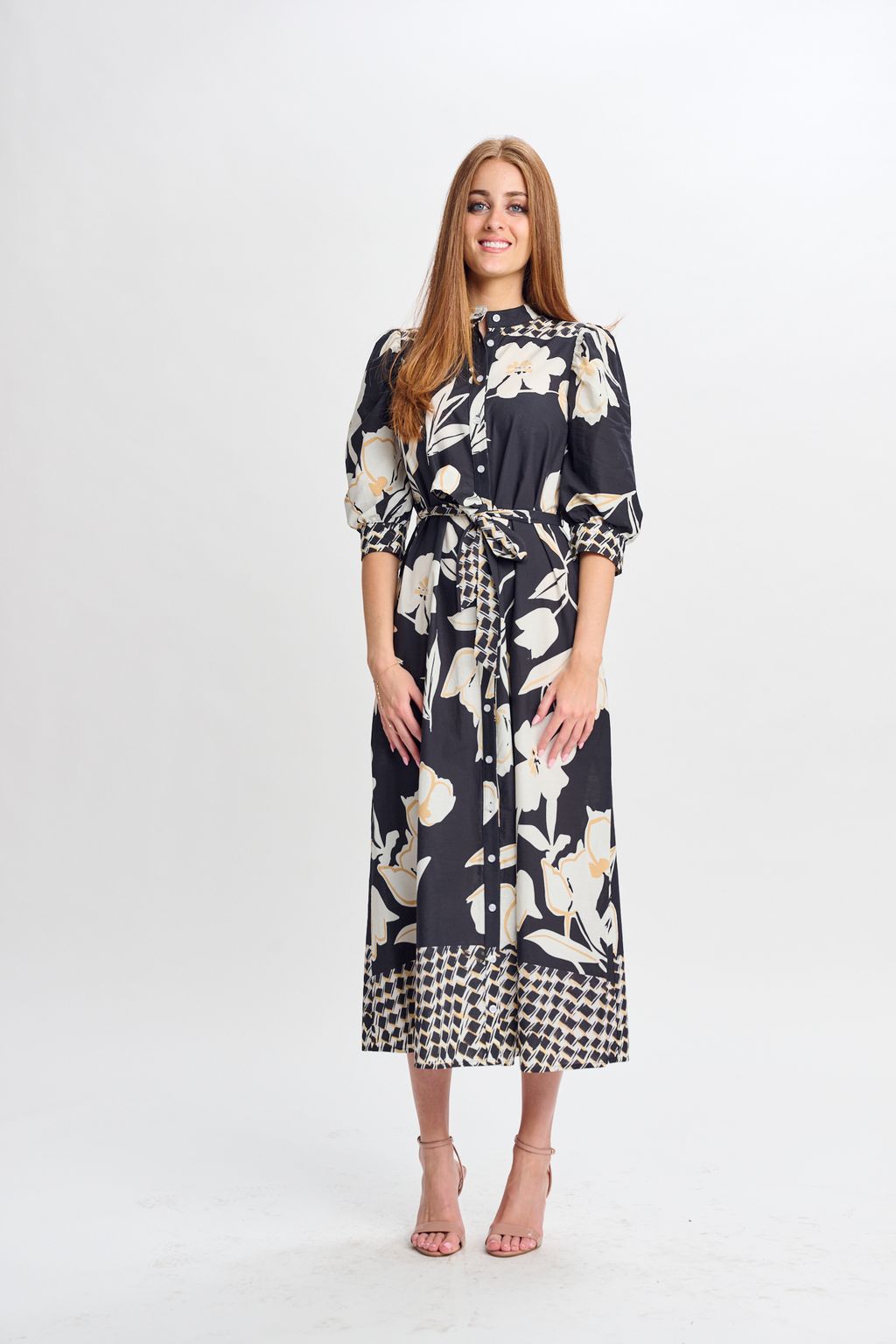 BLACK COTTON W/ WHITE FLORAL AND SQUARE PRINT DRESS 334855