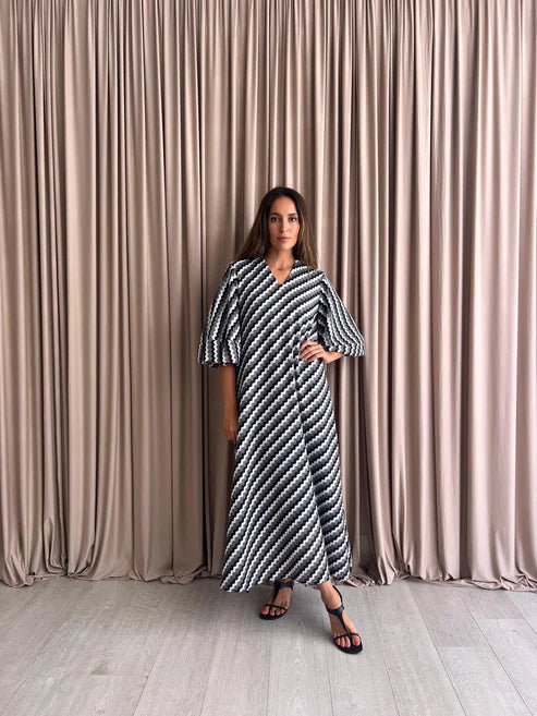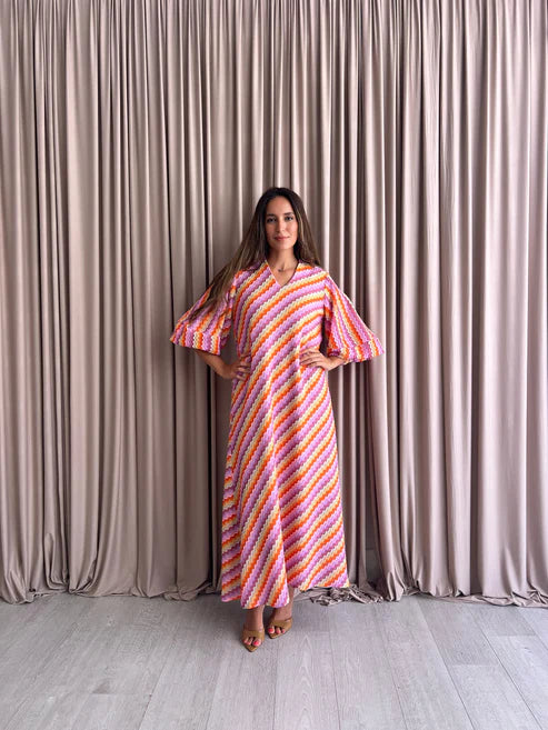 The Mia Maxi is your go-to dress for effortless elegance. Made from a breathable, textured knit, it flows beautifully with every step. The bold Zig Zag pattern adds character, while the relaxed fit and batwing sleeves bring comfort and volume. A true statement piece — vibrant, comfortable, and full of movement.