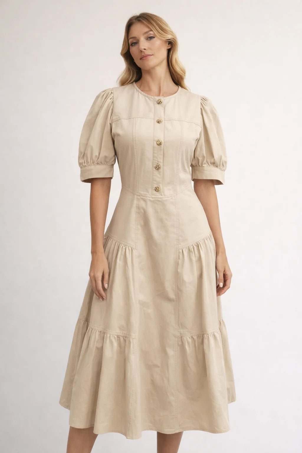 Featuring puff sleeves, intricate gold buttons, and a beautifully shaped bodice that flows into a gentle tiered skirt