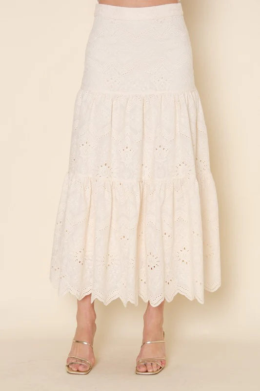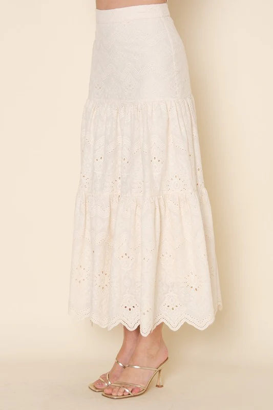 This high-waisted maxi skirt features an embroidered eyelet design with a tiered, ankle-length silhouette
