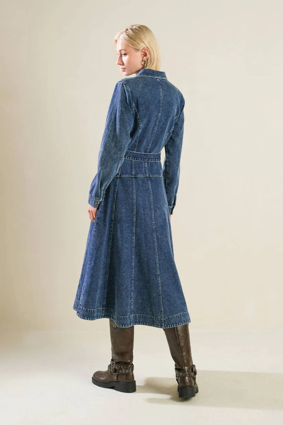 This washed denim dress features a refined feminine silhouette, making it an essential addition to your closet