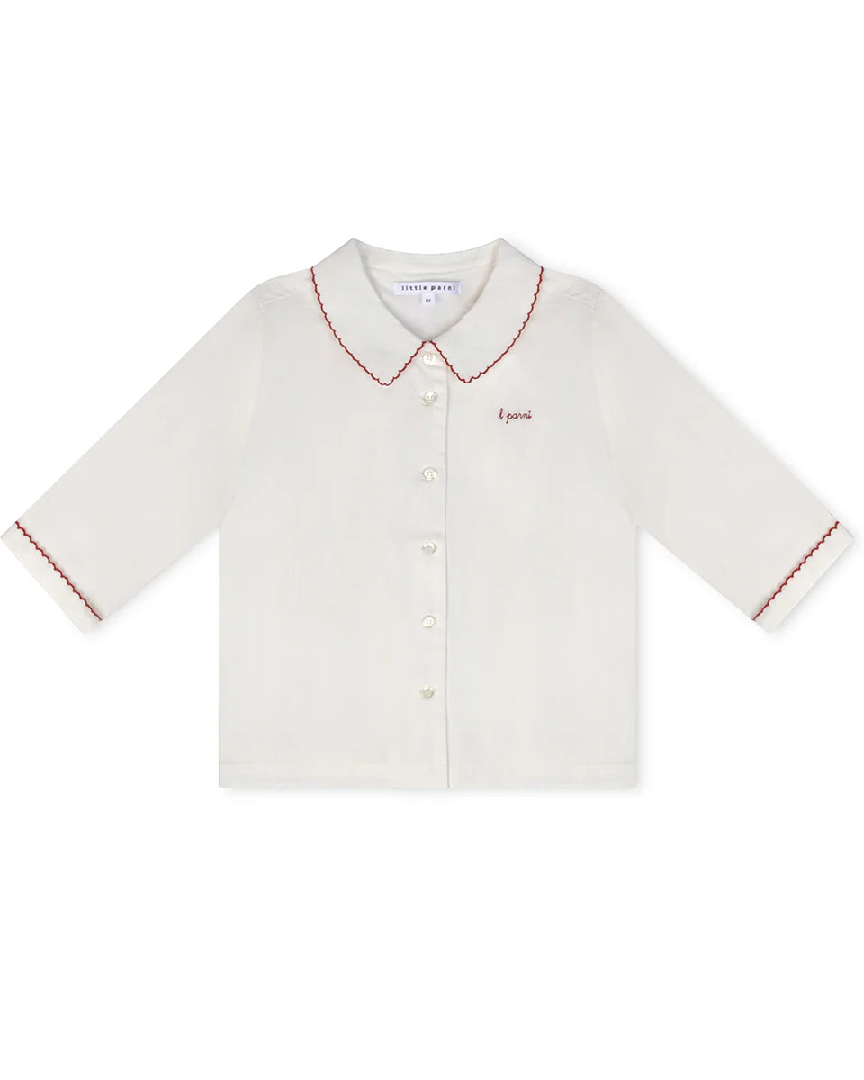 A charming button-up shirt featuring elegant 3/4-length sleeves and a classic rounded collar, finished with delicate picot trim along the collar and sleeve cuffs. Designed with a relaxed fit and front button closure, the shirt offers a soft yet structured silhouette. Subtle embroidered l. parni detailing on the chest adds a signature finishing touch. Versatile and easy to style, this timeless piece comes with a coordinating skirt and is available in pink and white.
