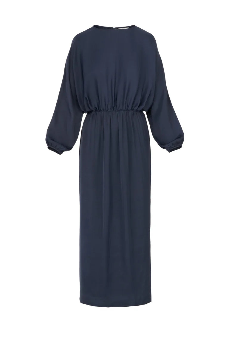 A fluid satin finish meets a relaxed blouse silhouette in this versatile dress. Effortlessly elegant, it drapes beautifully and transitions seamlessly from desk to dinner.