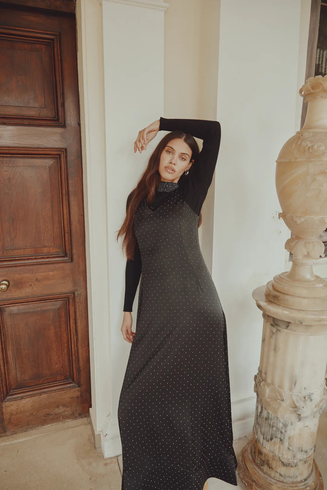 Sleeveless Rhinestone Maxi Dress with V-Neck Cut
