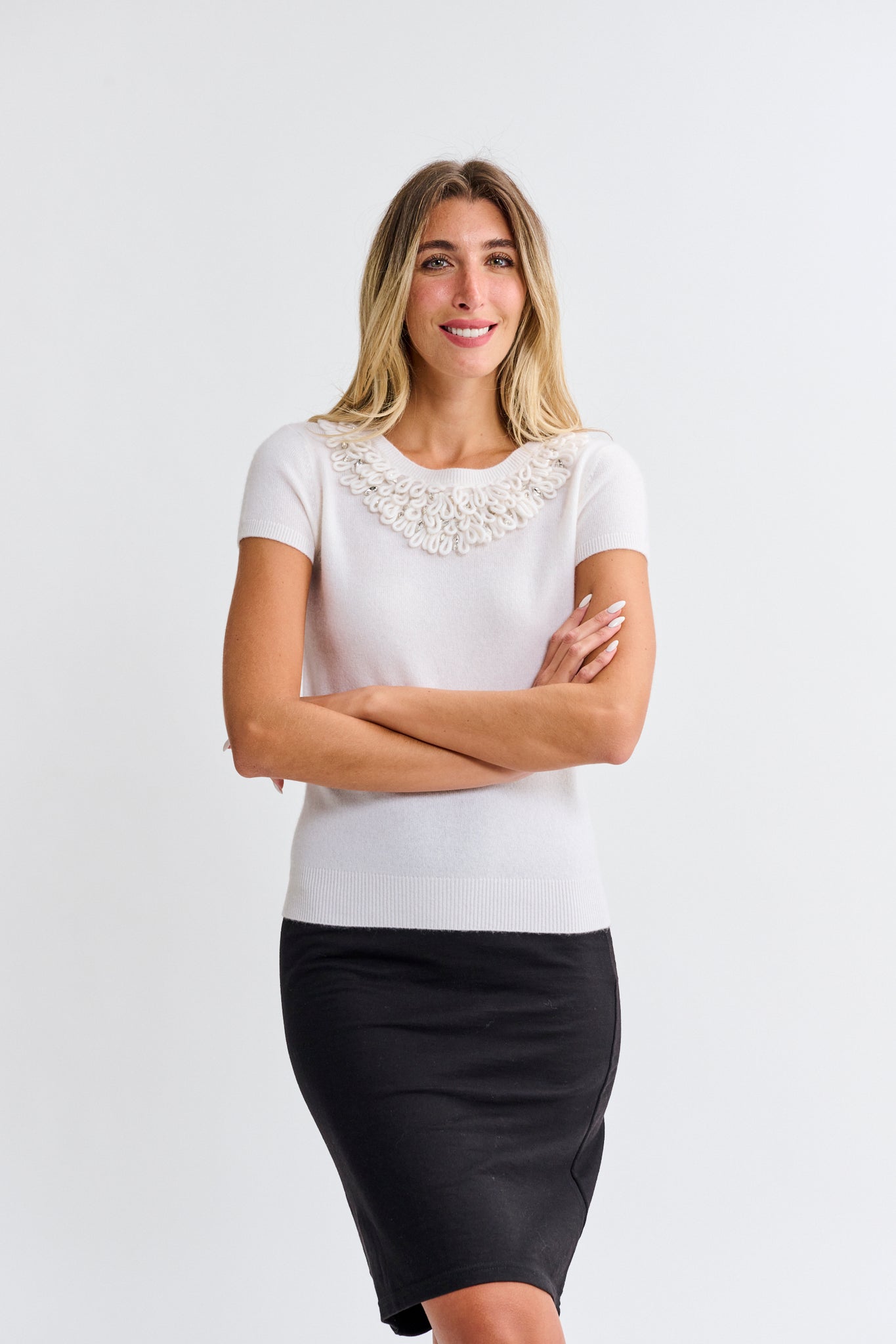 IVORY KNIT TOP WITH RHINESTONES & LOOPED TRIM AT NECK 334441