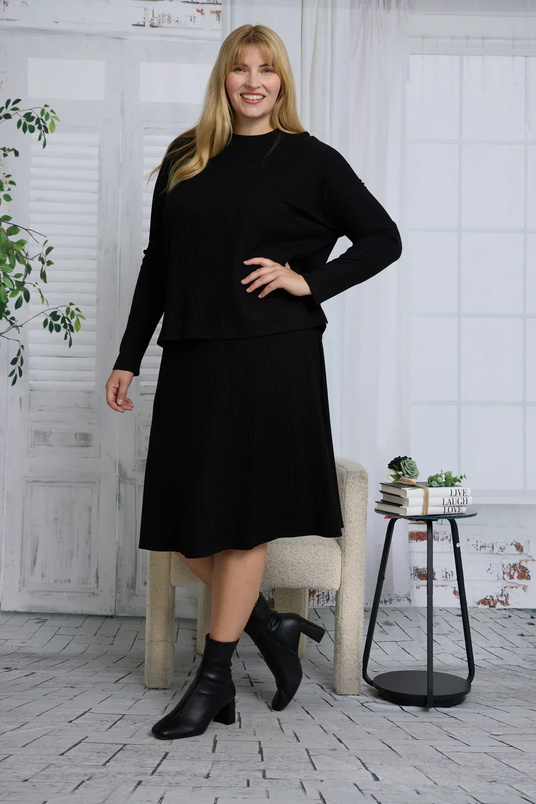The top features a relaxed silhouette and wide sleeves for a laid-back yet refined look, while the A-line skirt adds structure and polish