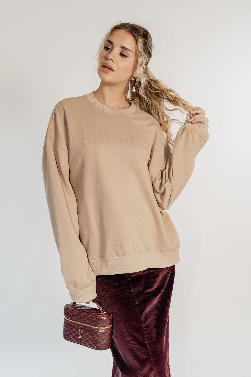 This warm sand crewneck is all cozy vibes with a ski-inspired touch