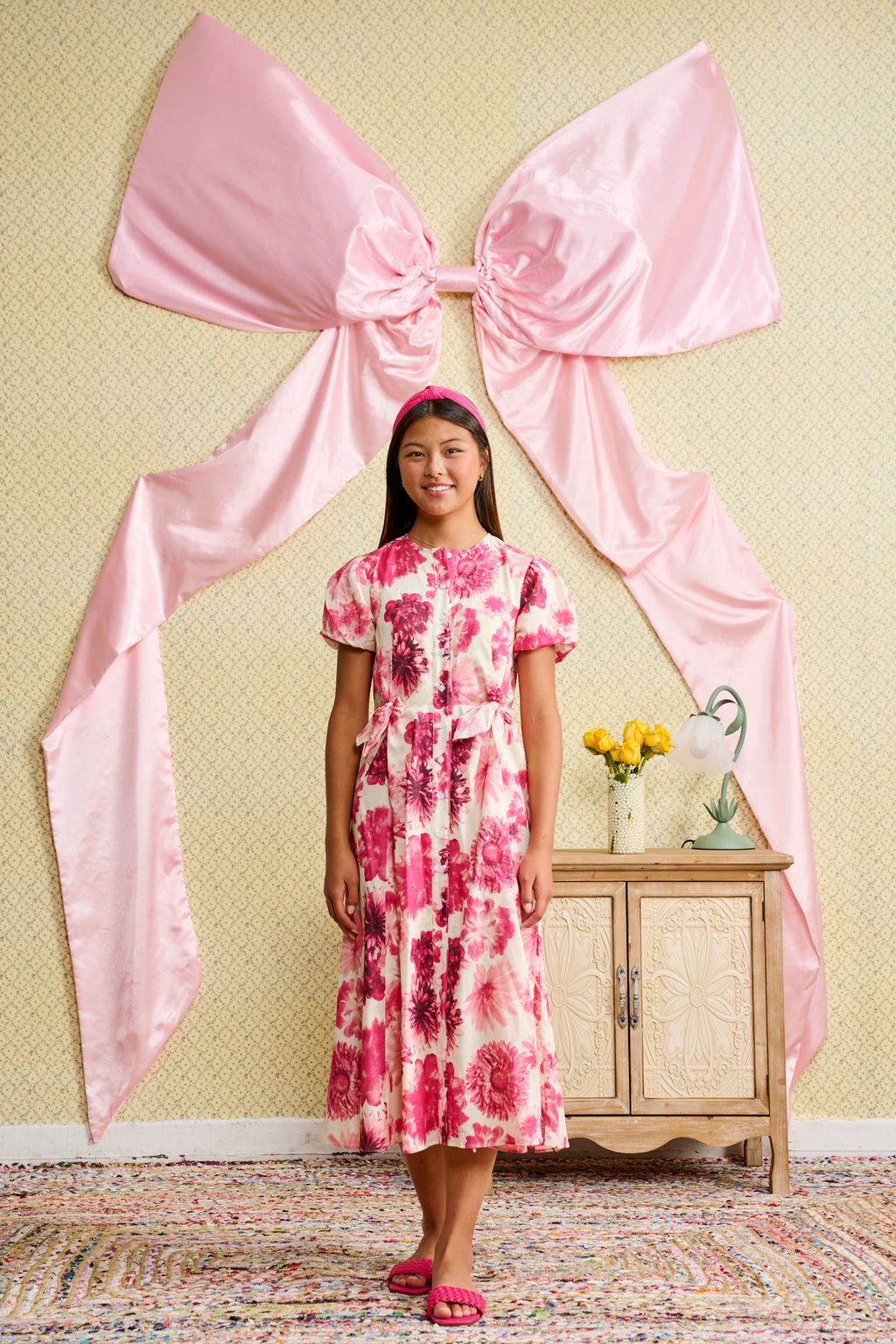 FLORAL BUTTON-DOWN DRESS WITH TIE TRIM AT WAIST T-1231