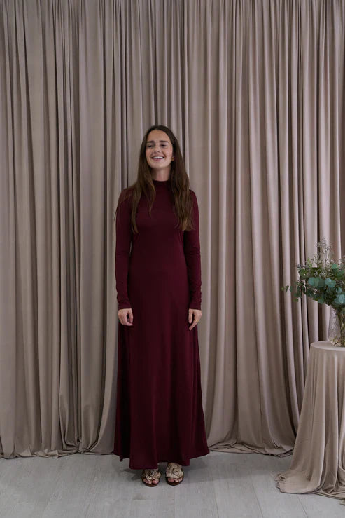 With a high collar, long sleeves, and a fitted shape that flares gently below the knees, it creates a clean, sculpted silhouette without feeling rigid