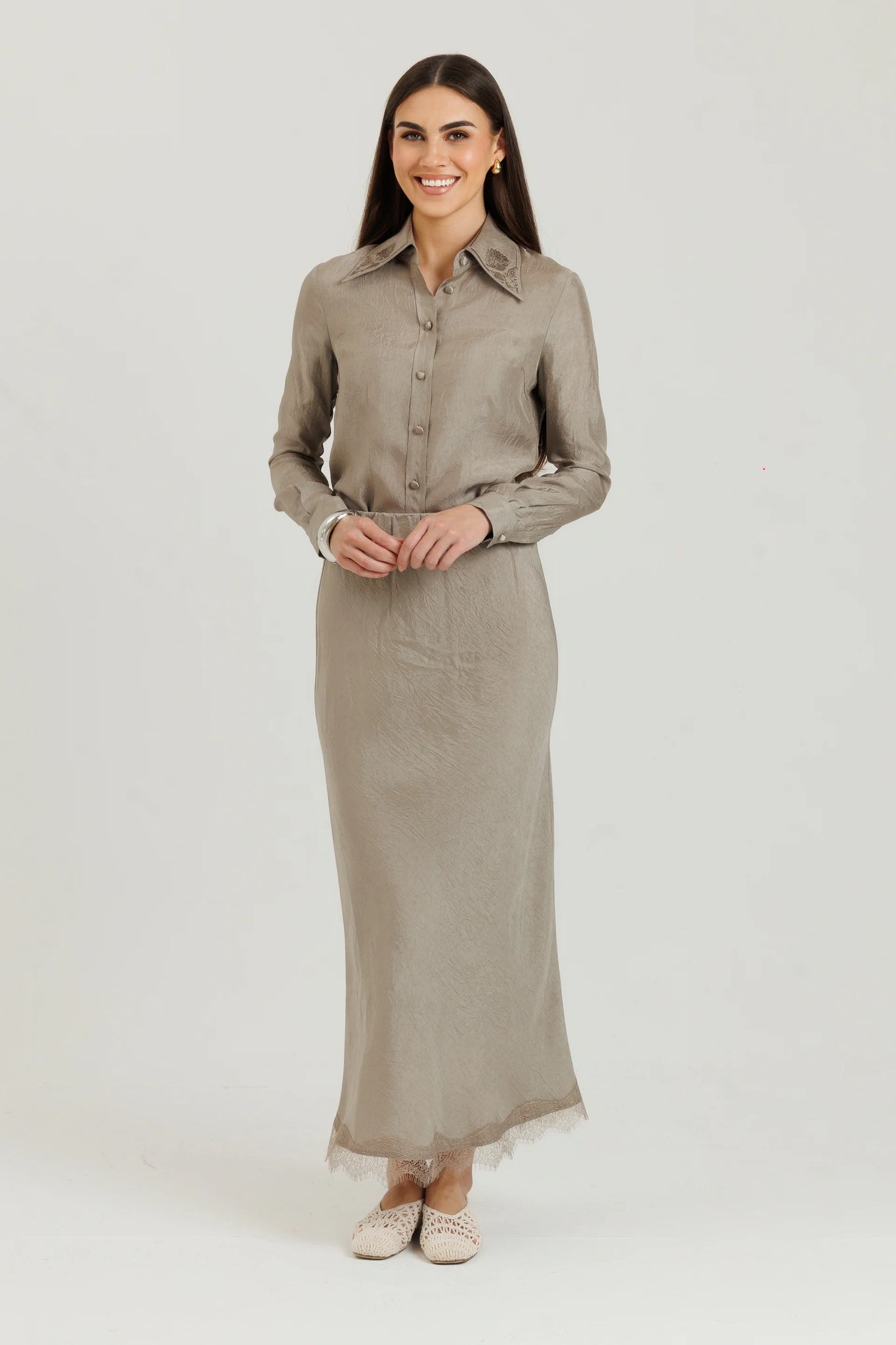 This lace slip skirt is feminine, lightweight, and effortlessly flattering, with a soft drape that elongates and smooths without clinging.The perfect alternative to pair with our embroidered blouse