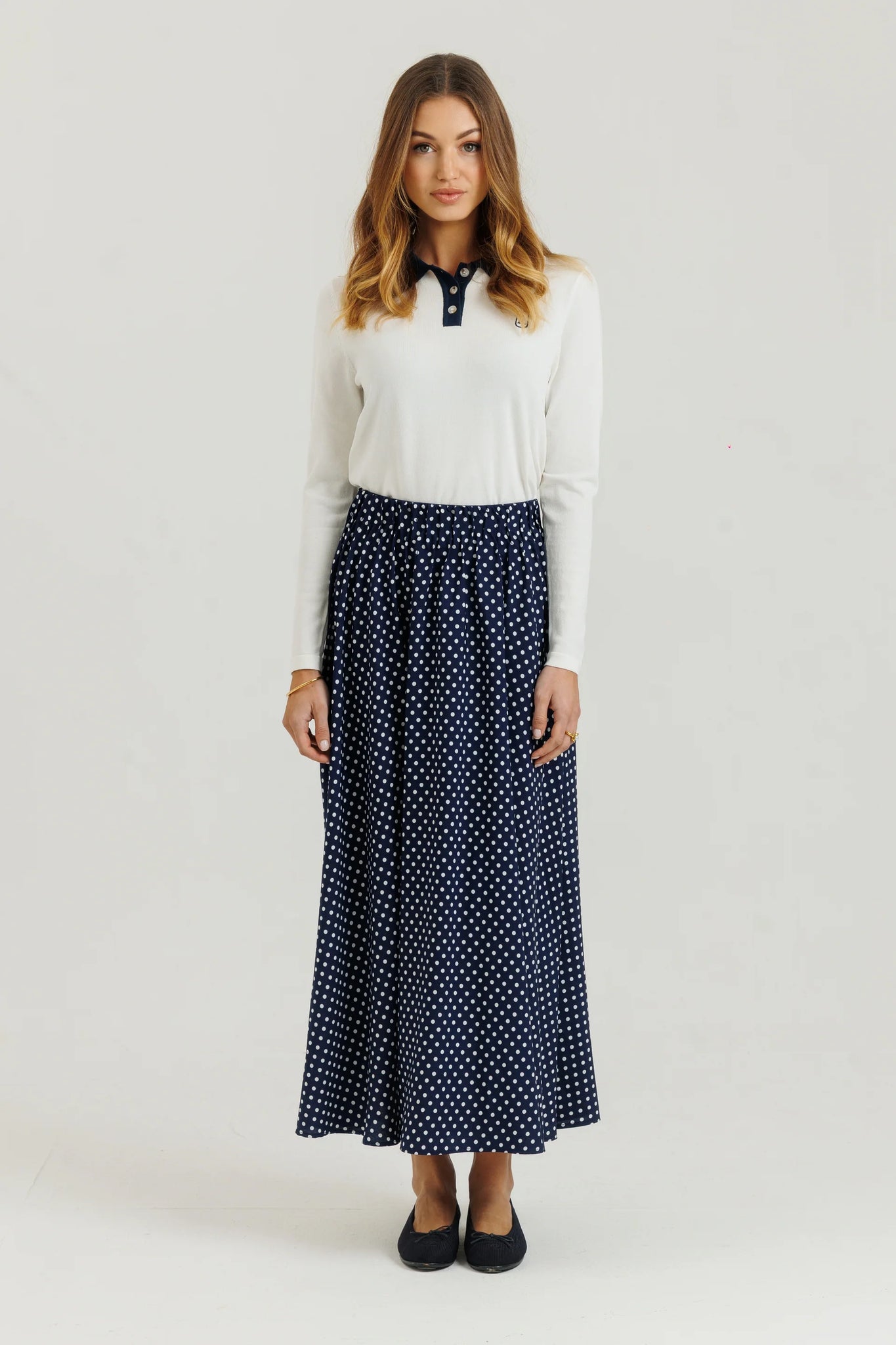 A timeless Navy and white polka dot skirt designed to feel as good as it looks. Featuring a comfortable elastic waistband for the perfect fit, it flows into a full, girly silhouette that moves beautifully with every step. Easy to dress up or down, it’s the kind of piece you’ll reach for again and again.