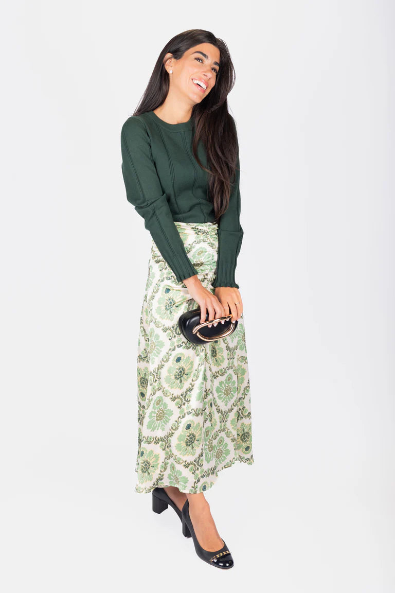 Effortlessly chic with a vintage flair, this silky midi skirt features a lush green floral damask print on a soft ivory base. Designed with delicate ruching at the front for a flattering shape and fluid movement with every step. Pair it with a fitted top and sandals for a fresh daytime look or elevate it with heels for summer evenings out.