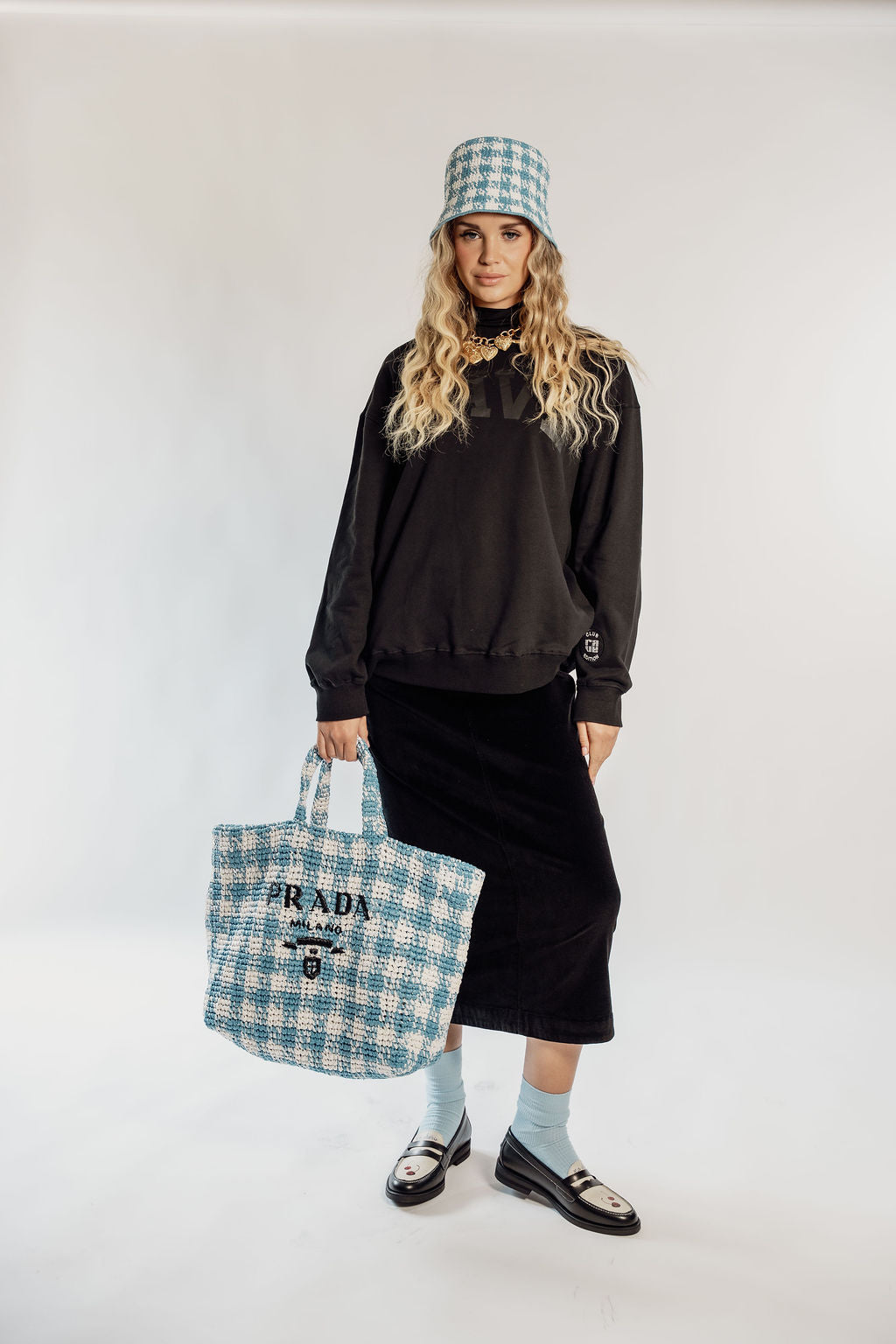 This black crewneck stays classic with a bold signature front and a subtle branded sleeve patch