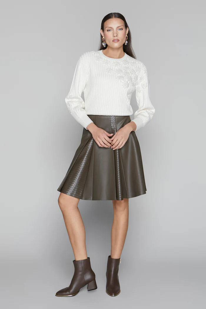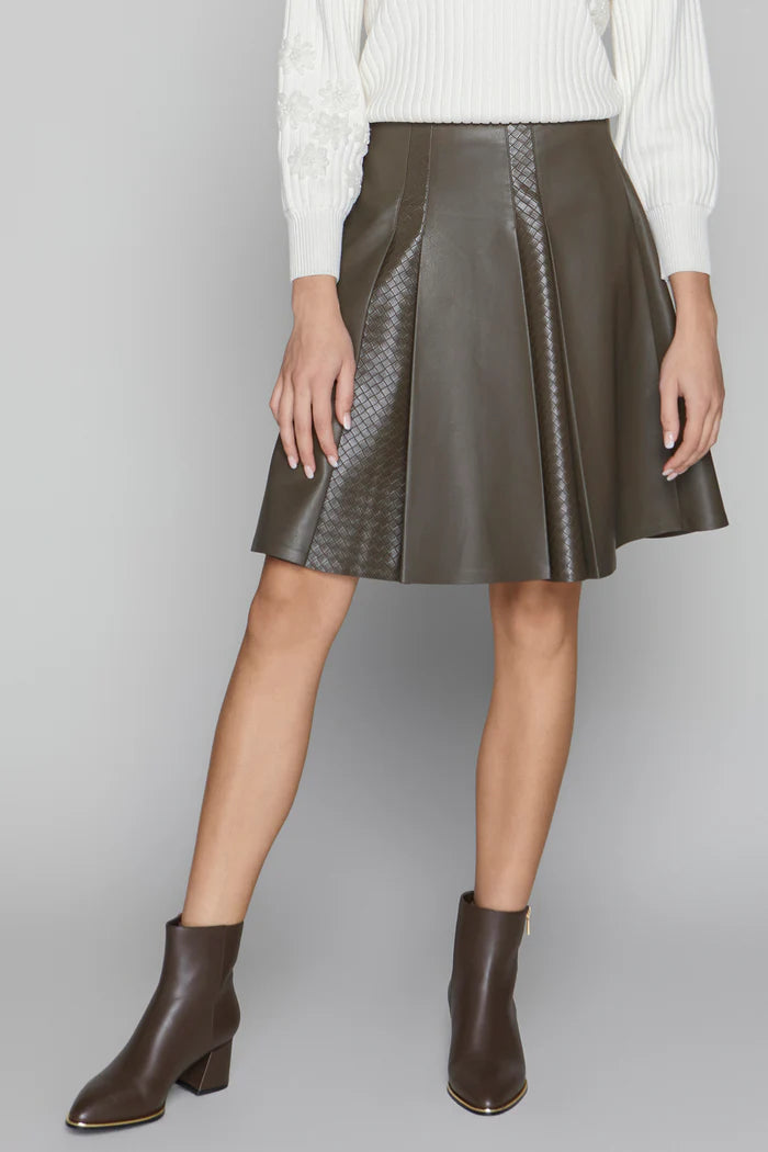 The Concord Skirt combines dual textures of woven and solid leather, creating a refined contrast that elevates its design. Featuring wide pleats, this skirt offers a graceful silhouette with movement and structure. Perfect for sophisticated occasions, it blends modern edge with timeless elegance.