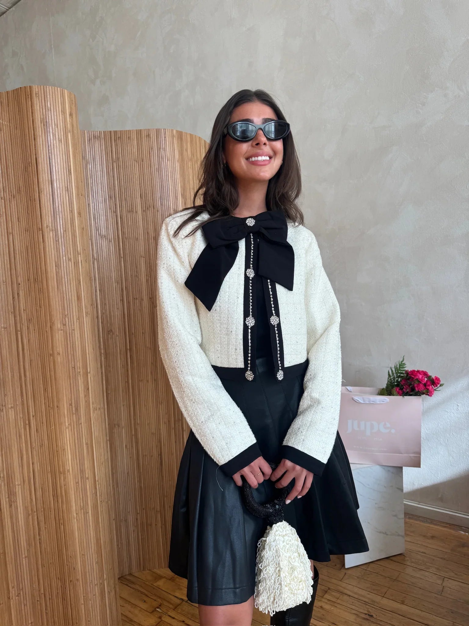 This long-sleeve cropped jacket features sequin tweed fabric with a bow trim detail at the front