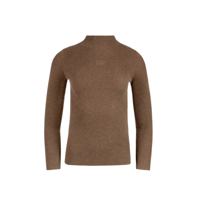 A brown ribbed mock neck top crafted from soft, comfortable fabric for a cozy yet polished look