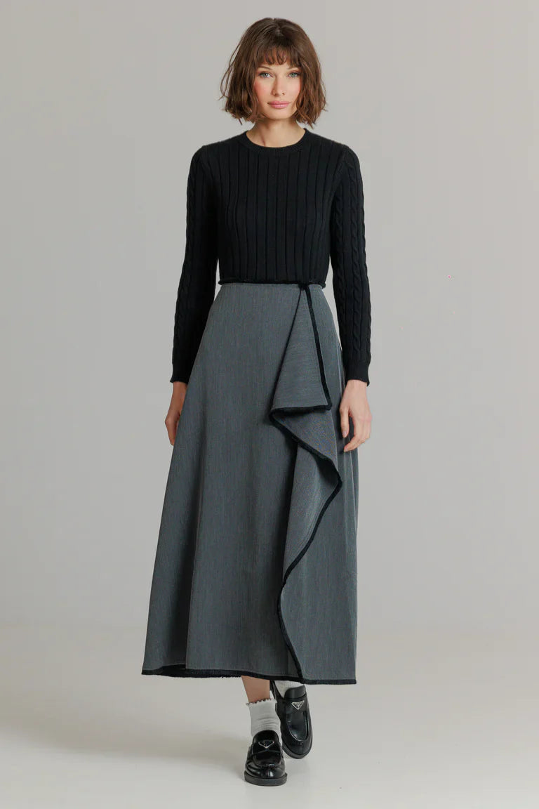 This maxi skirt features classic herringbone fabric and a raw frayed fringe edge for a touch of effortless edge