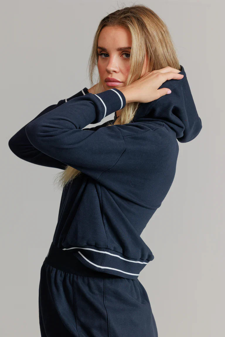 A cropped navy hoodie sweater in soft tracksuit fabric, designed for sporty comfort and effortless style