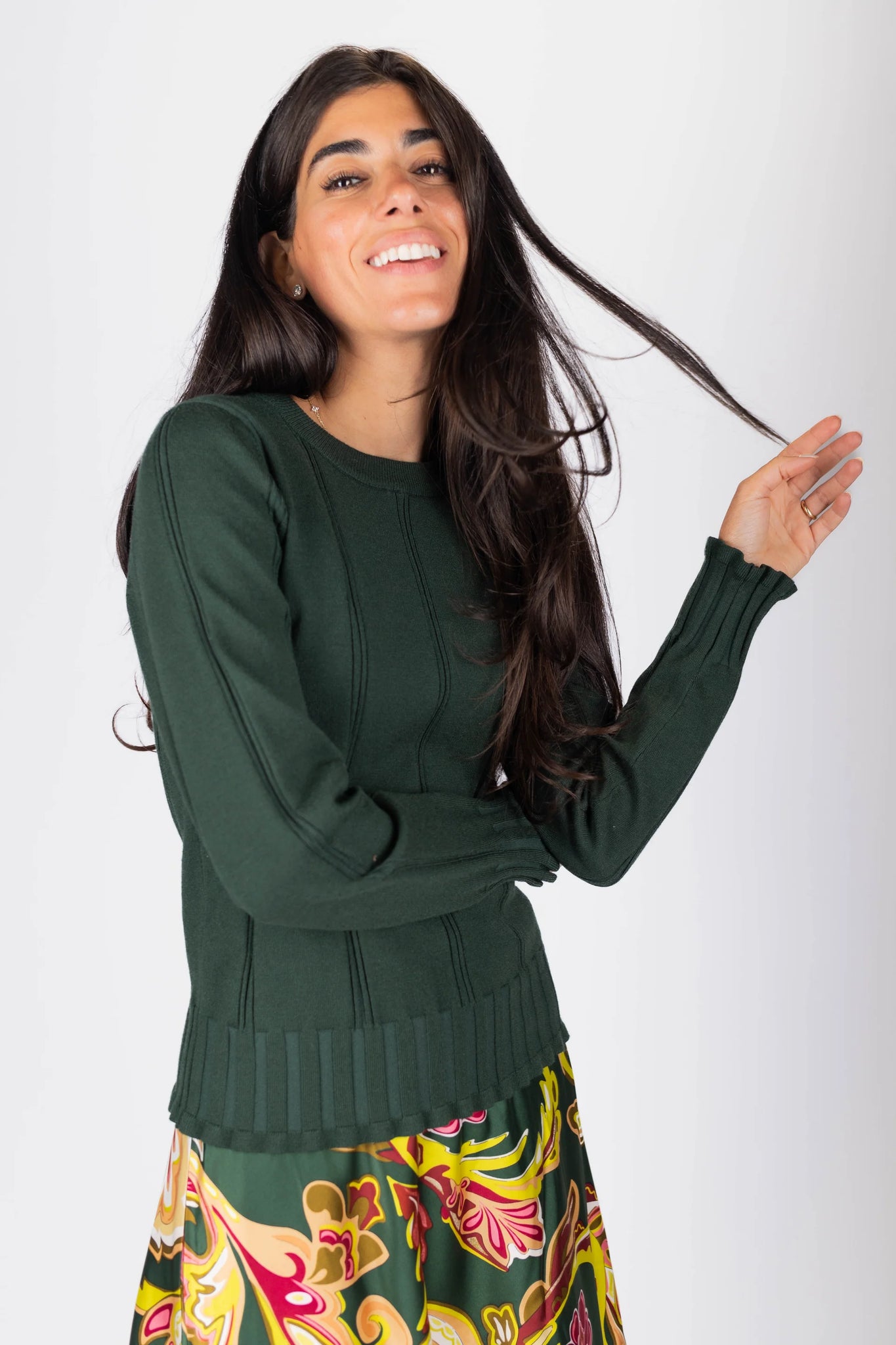 The Claire is our elegant ribbed knit top in a rich teal color. Featuring a classic round neckline and vertical ribbed detailing, this top offers a flattering silhouette with a hint of texture. The soft knit fabric and ruffled hem and cuffs add subtle charm and femininity, making it a perfect choice for both casual and dressy occasions.