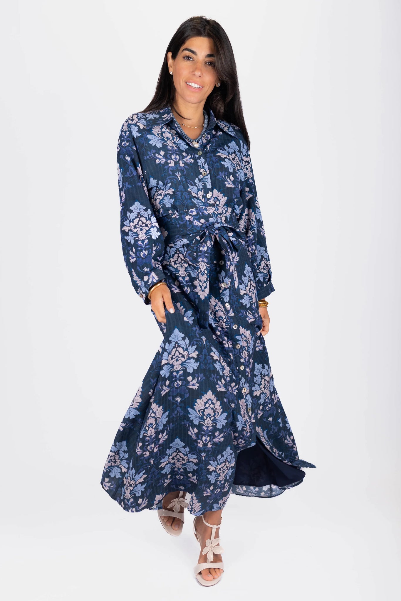 Step into timeless elegance with this navy maxi dress, adorned with an intricate floral damask print in shades of periwinkle and soft lilac. The collared button-down design, self-tie waist belt, and voluminous sleeves create a flattering, elevated silhouette. Lightweight and flowy, it’s the perfect statement piece for both day and evening occasions.