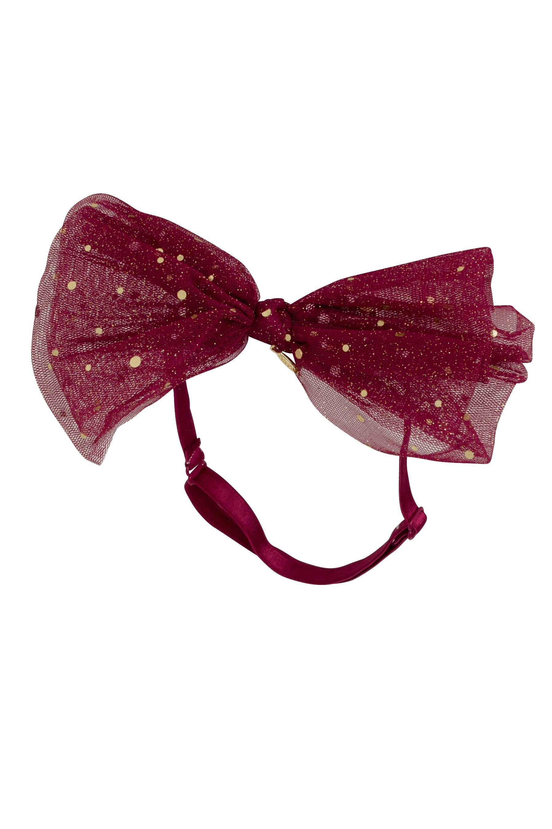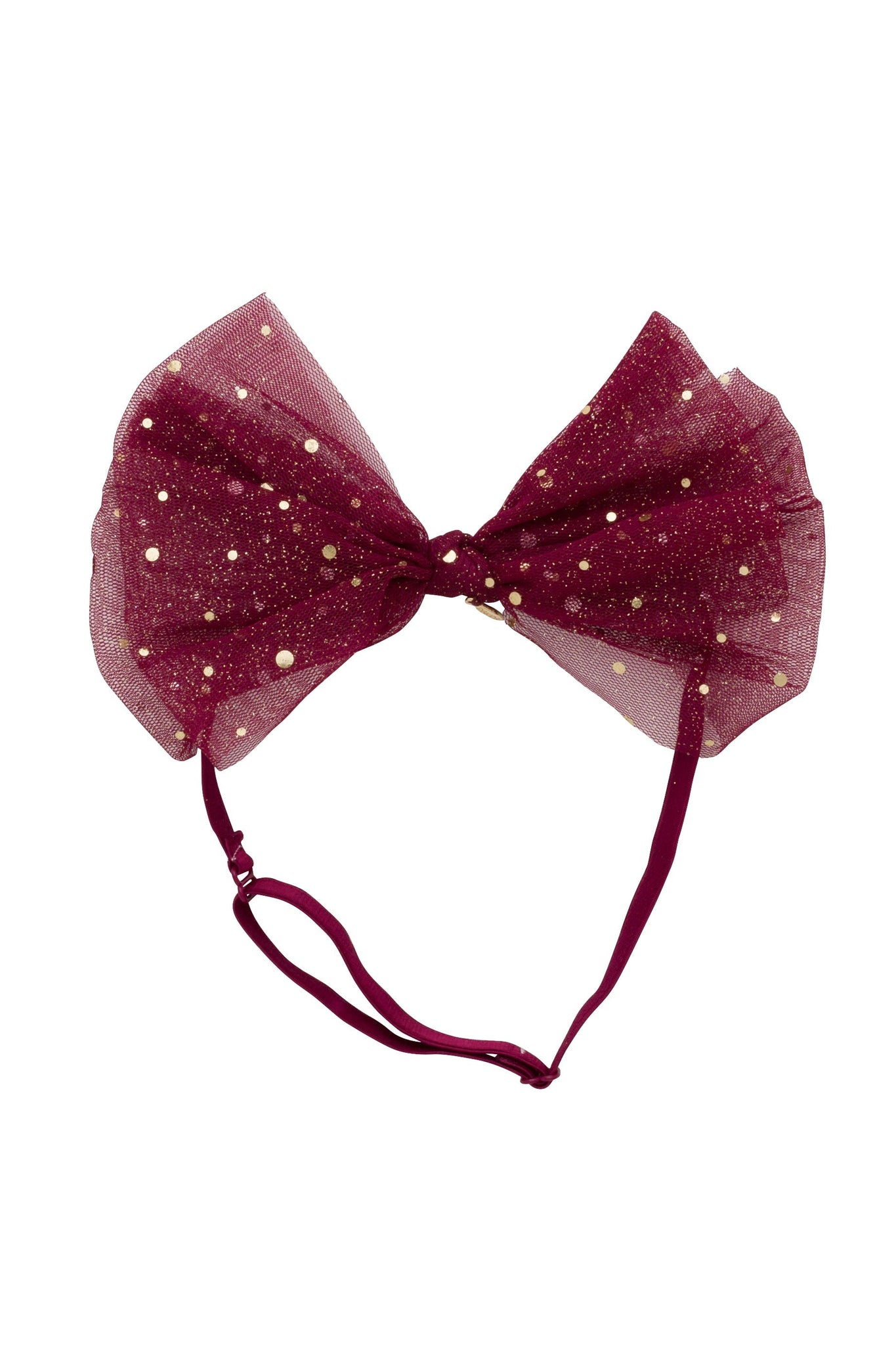 Ava Dot Headband is a fine tulle bow with small gold dots on a headband or hair wrap.
