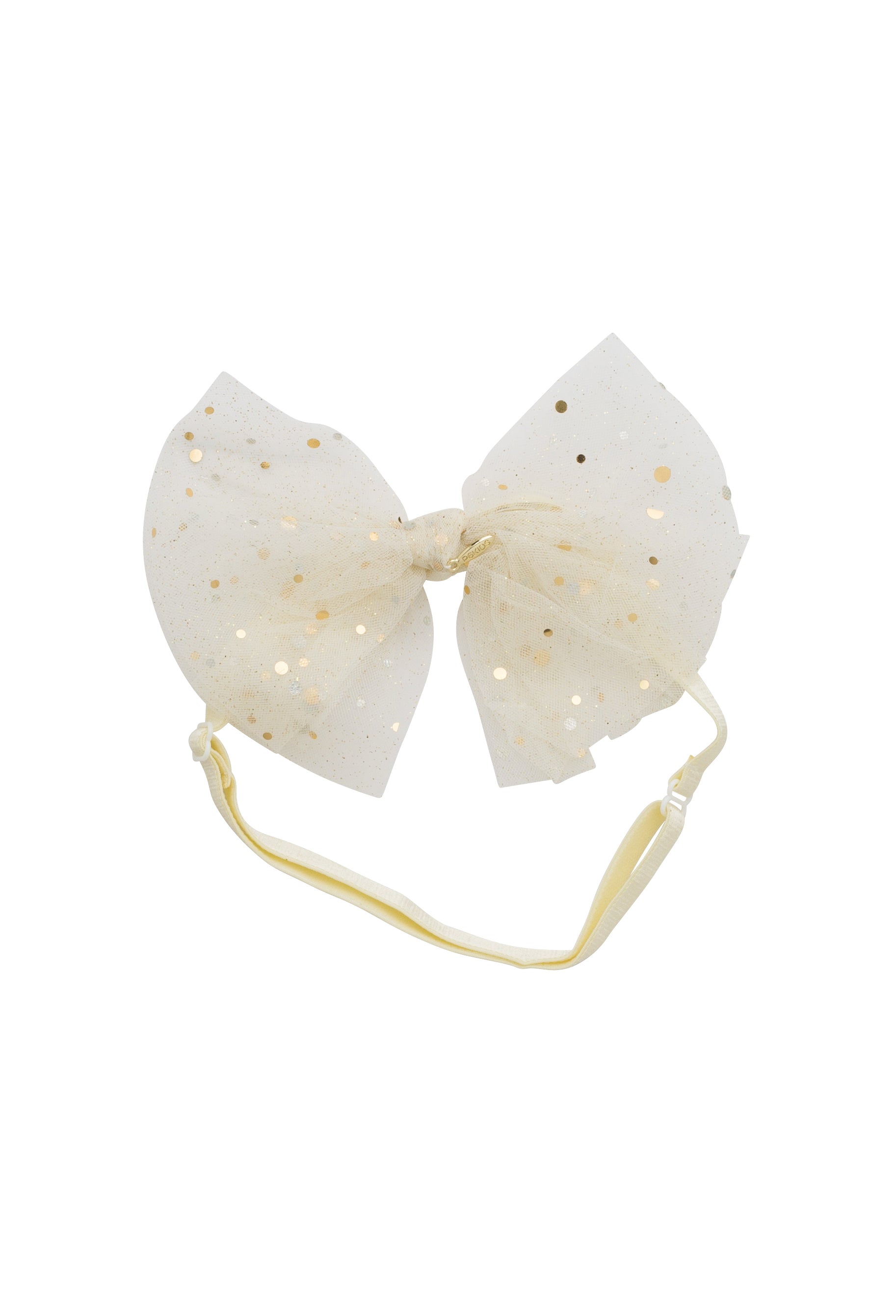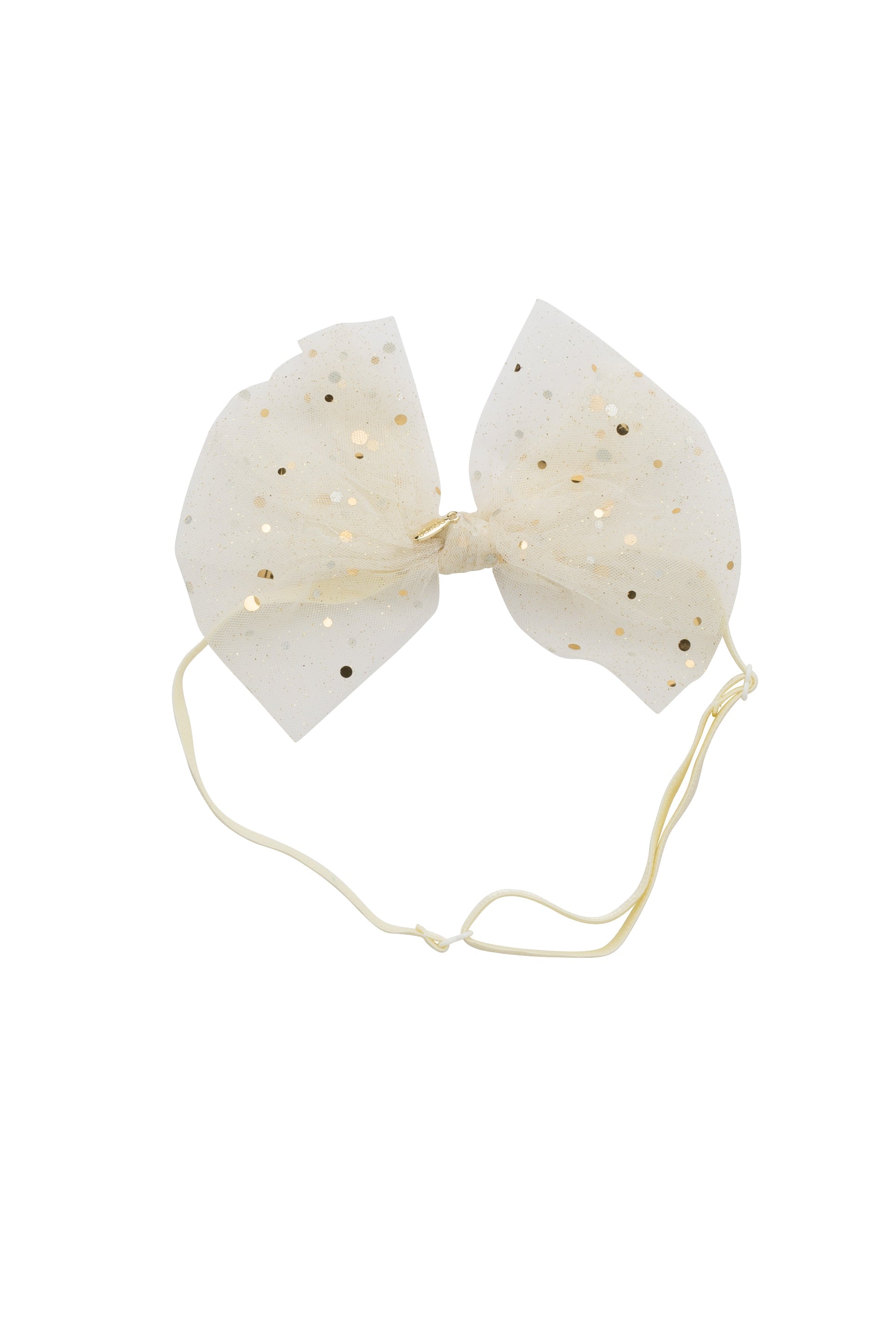 Ava Dot Headband is a fine tulle bow with small gold dots on a headband or hair wrap.