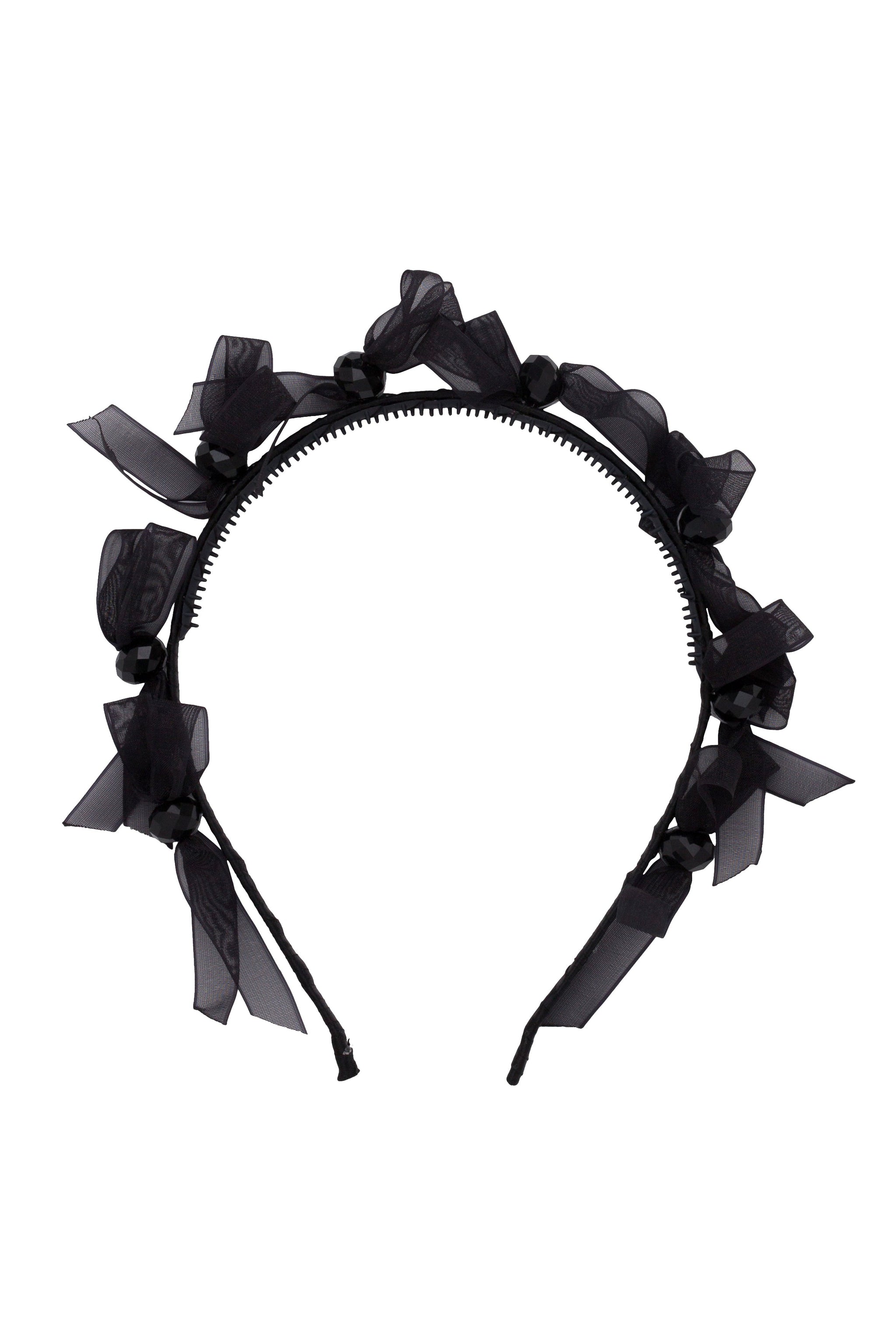 This design is created with several beads that have 2 loops of organza ribbon fed through it. This headband is reminiscent of ballet dancers. This style is handmade by artisans in Colombia.