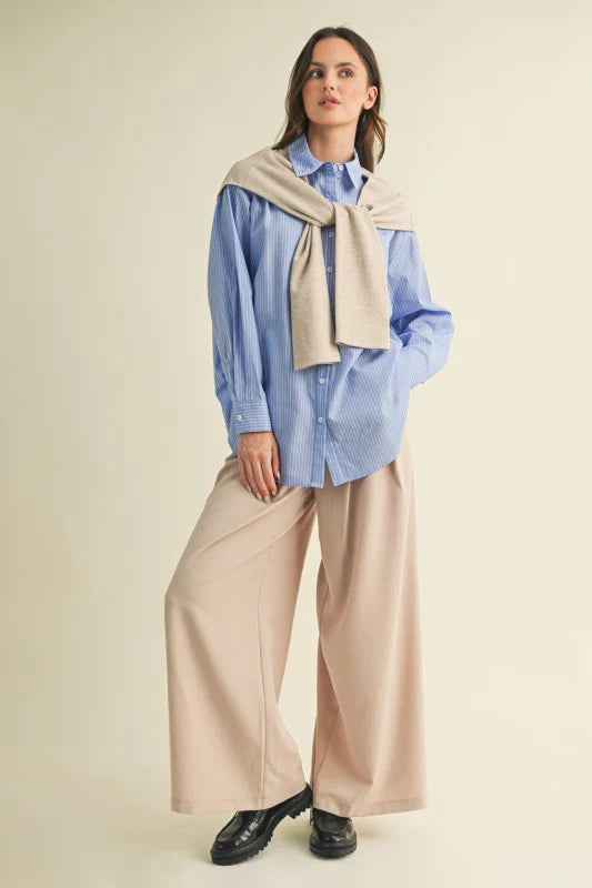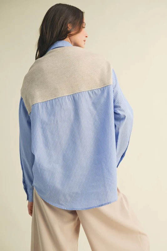 The Rowan Top blends a crisp cotton-striped shirt with soft knit sleeves, creating an easy, mixed-media piece that balances polish and comfort