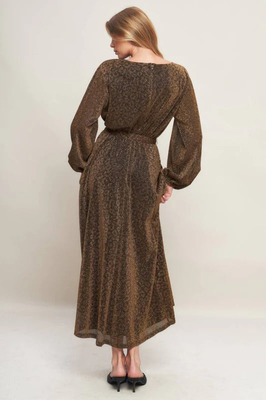 Step into the spotlight with The Glitter Hour Dress, a metallic-threaded woven midi that brings shimmer to every occasion