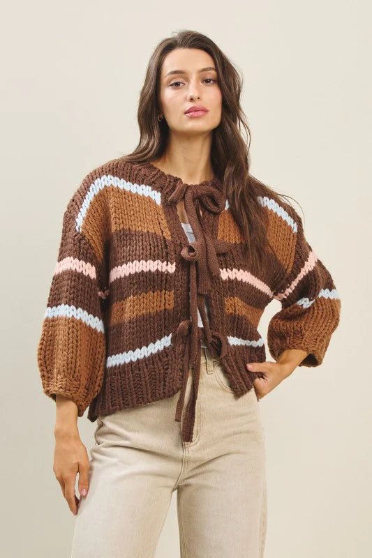 This colorblock chunky cardigan features long sleeves, a striped knit pattern, and a bow-tie front for a flirty, feminine touch