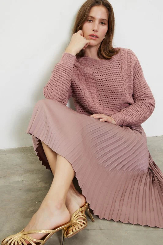 The open-stitch sweater adds texture and warmth, while the satin midi—finished with a V-neck, elastic waist, and soft pleats—flows with ease