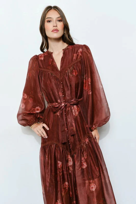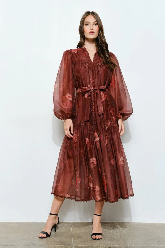Romantic and effortlessly chic, the Ophelia Dress features delicate floral organza with lace and ruffle detailing
