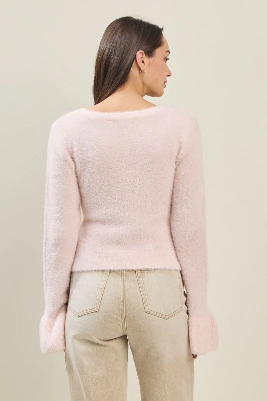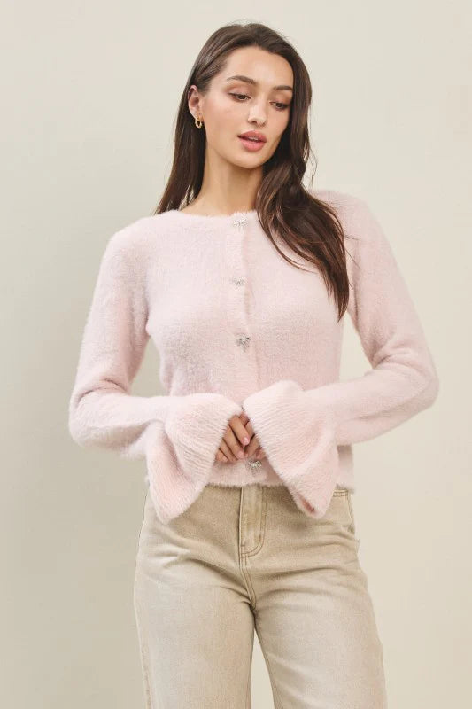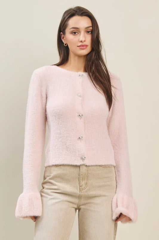 This light pink fuzzy cardigan is decked out with sparkling rhinestone bows and button-down details, making it the ultimate statement piece for layering over your favorite tops or dresses