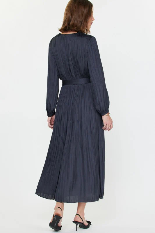 The Milan Dress is a pleated long-sleeve midi with a round neckline and keyhole button closure for subtle elegance