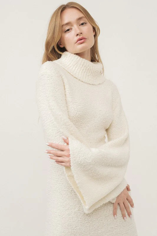 A winter essential, the Verona Dress features a pull-on turtleneck design, dramatic bell sleeves, and a sweeping maxi silhouette