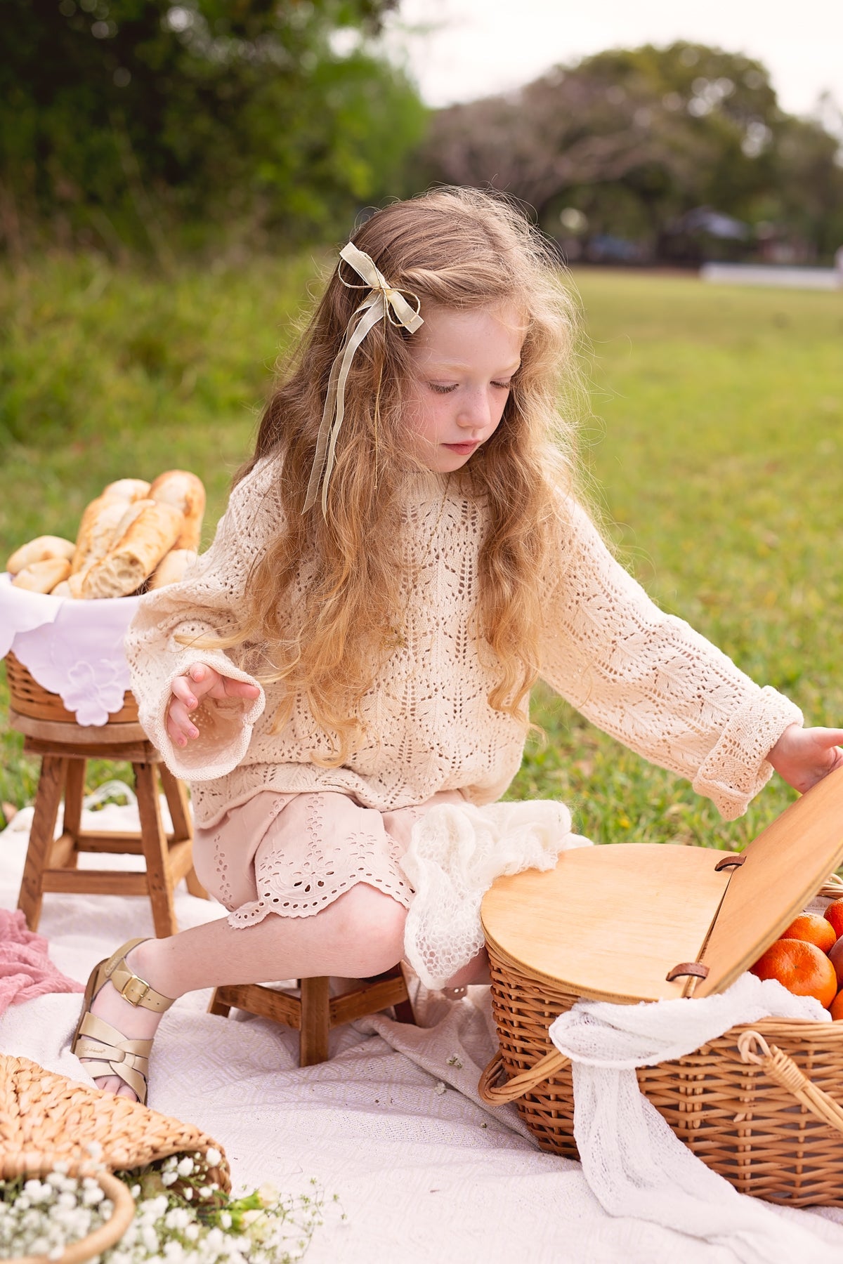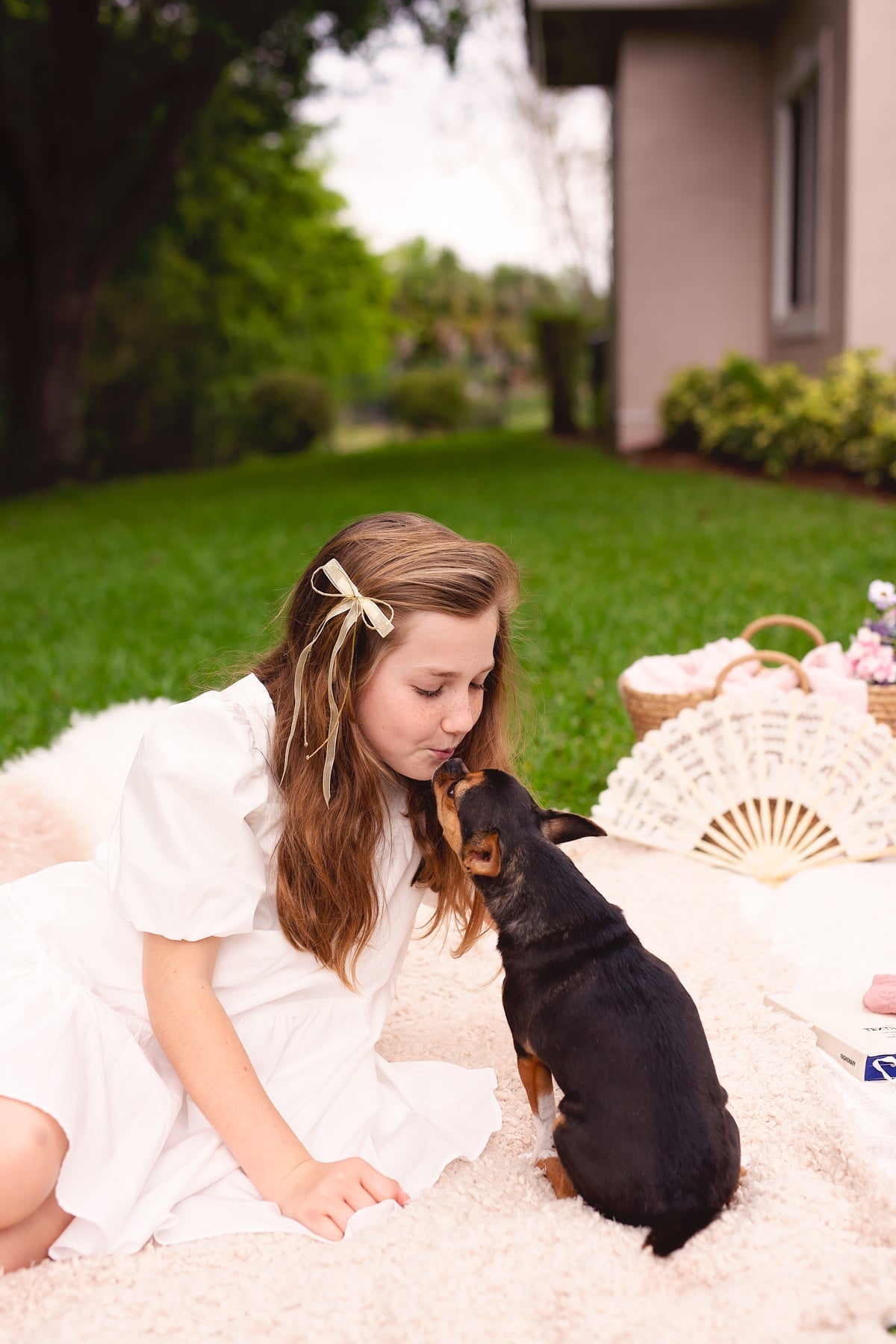 I've been sampling longer bows with a blend of different ribbons and fabrics together. This one was the final winner for this season! It's dainty and angelic and adds so much to your outfit, trust me! It's about 7" long.