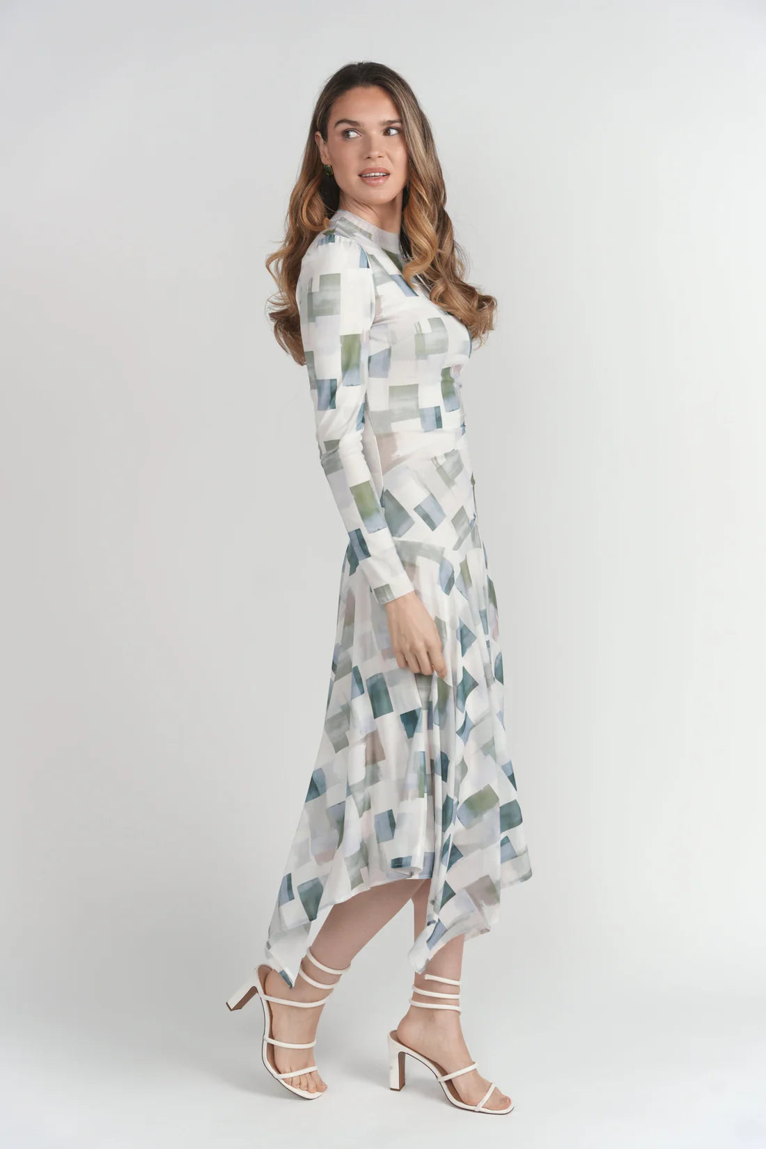 - Slight puff sleeve detail at the shoulder seam, side-seam ruching, drop waist, and handkerchief hem for dynamic shape and movement.