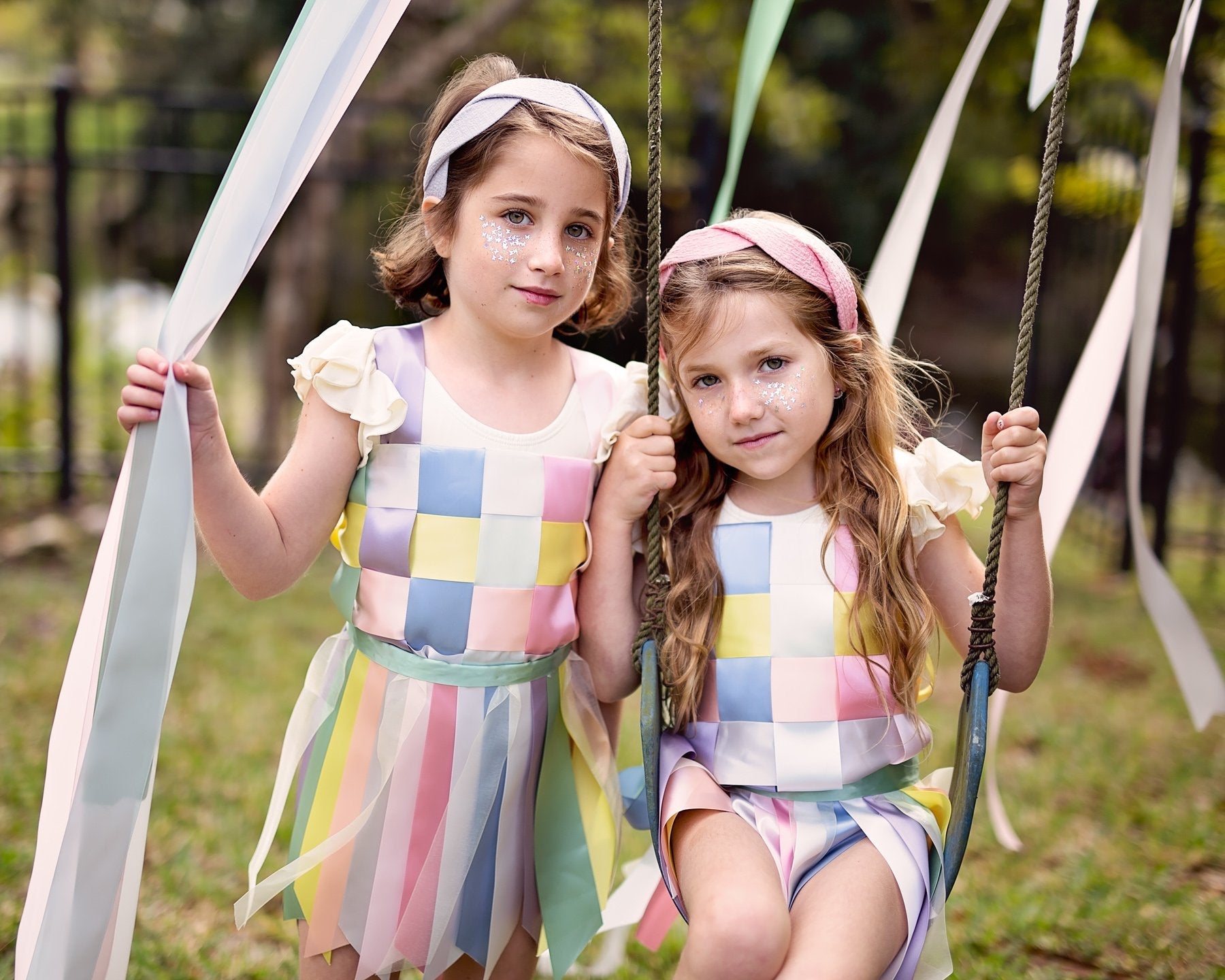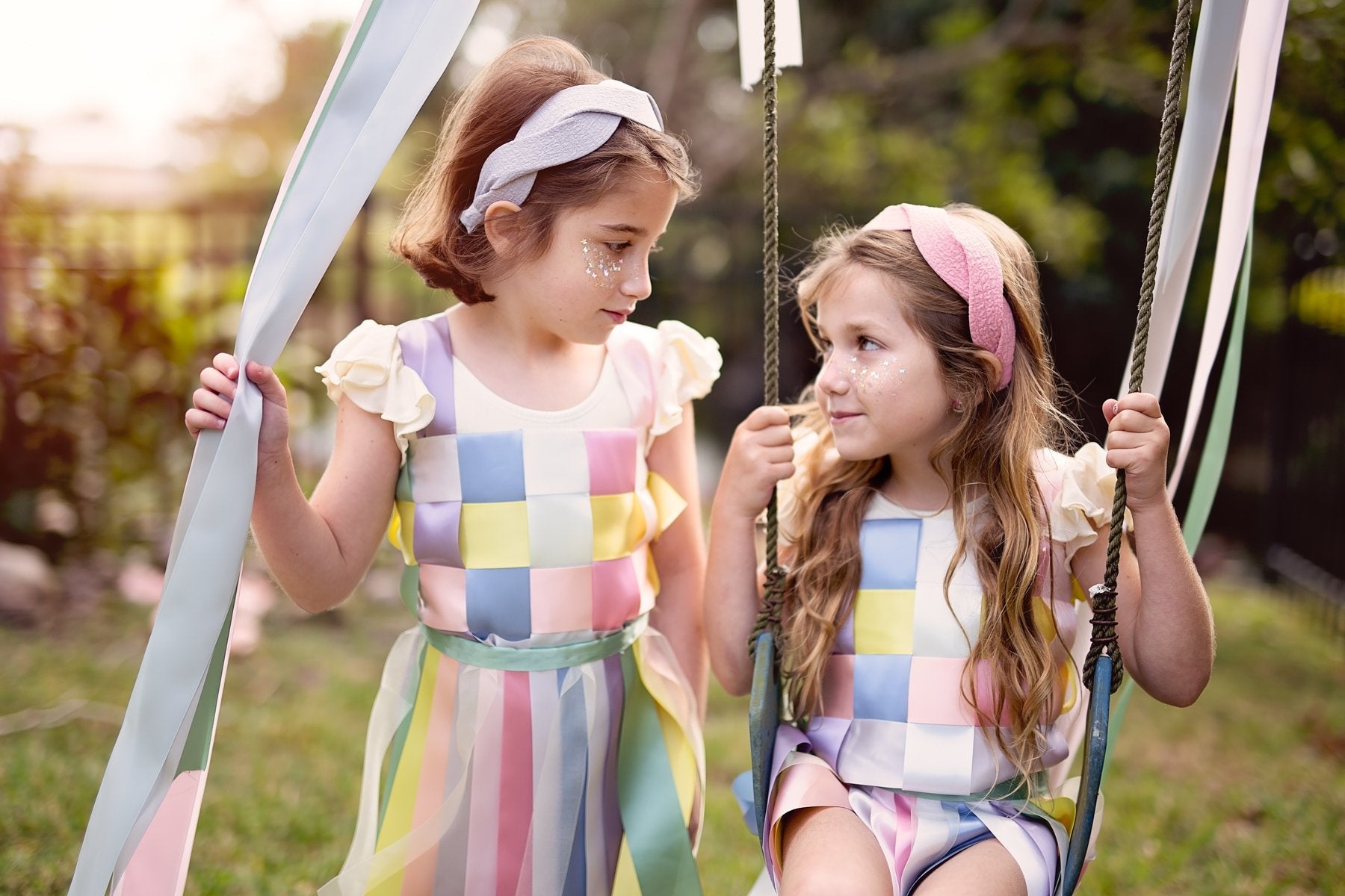 Two Intertwined twisted headbands wrapped in a muslin gauze fabric creating a unique octagon shape when worn.