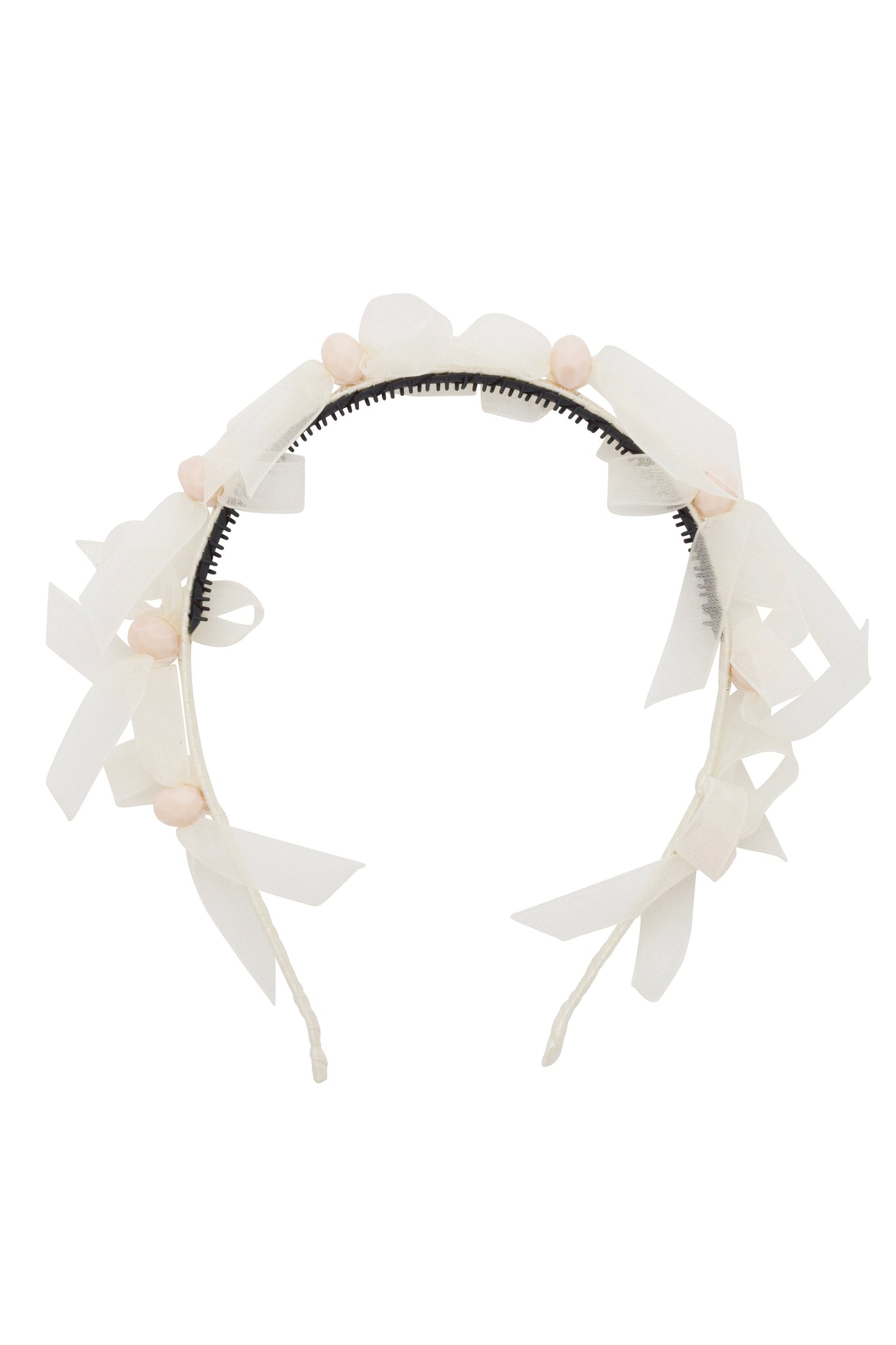 This design is created with several beads that have 2 loops of organza ribbon fed through it