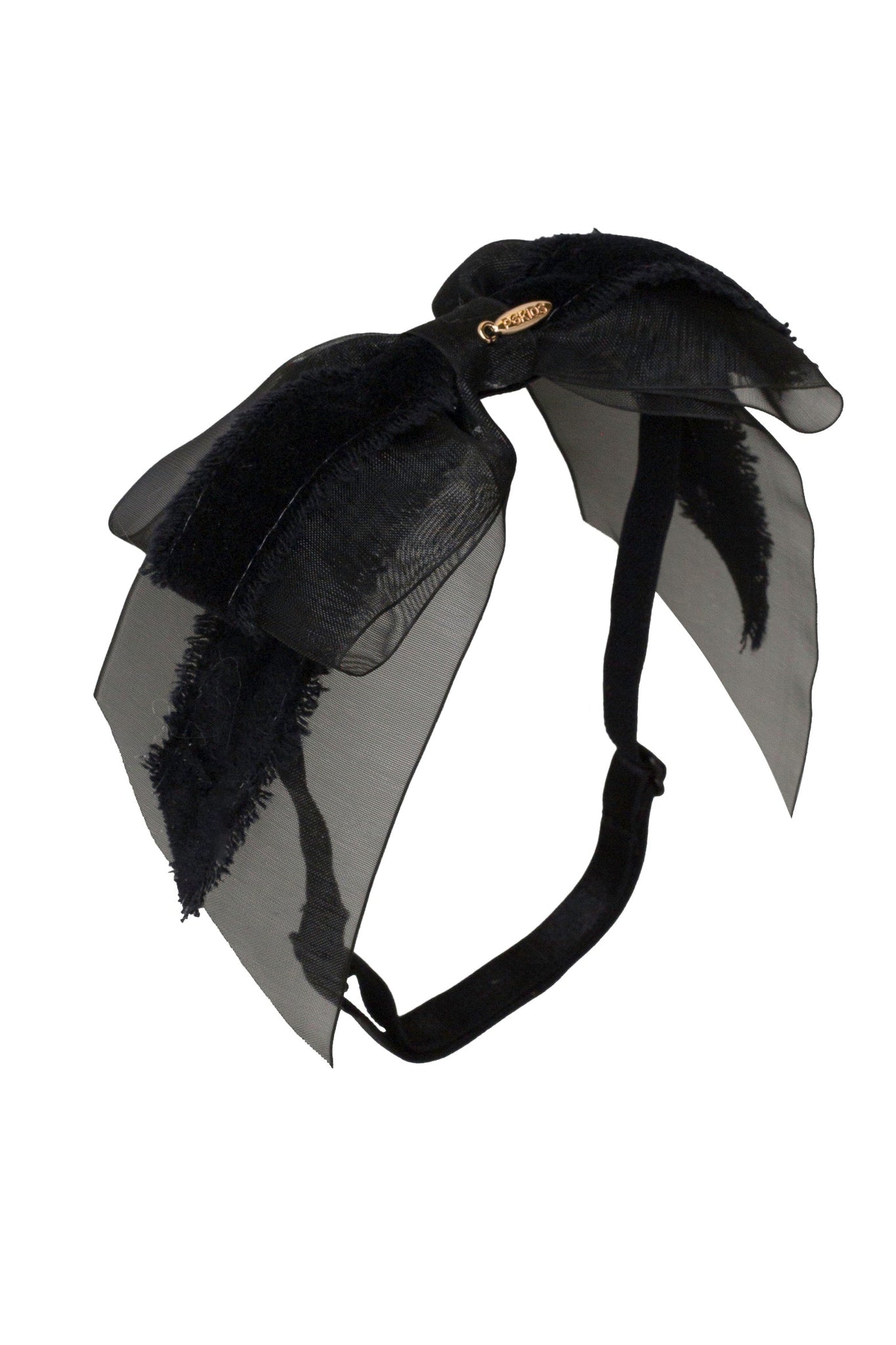 A stunning bow inspired adjustable hair wrap with organza and a velvet-like material with fringe