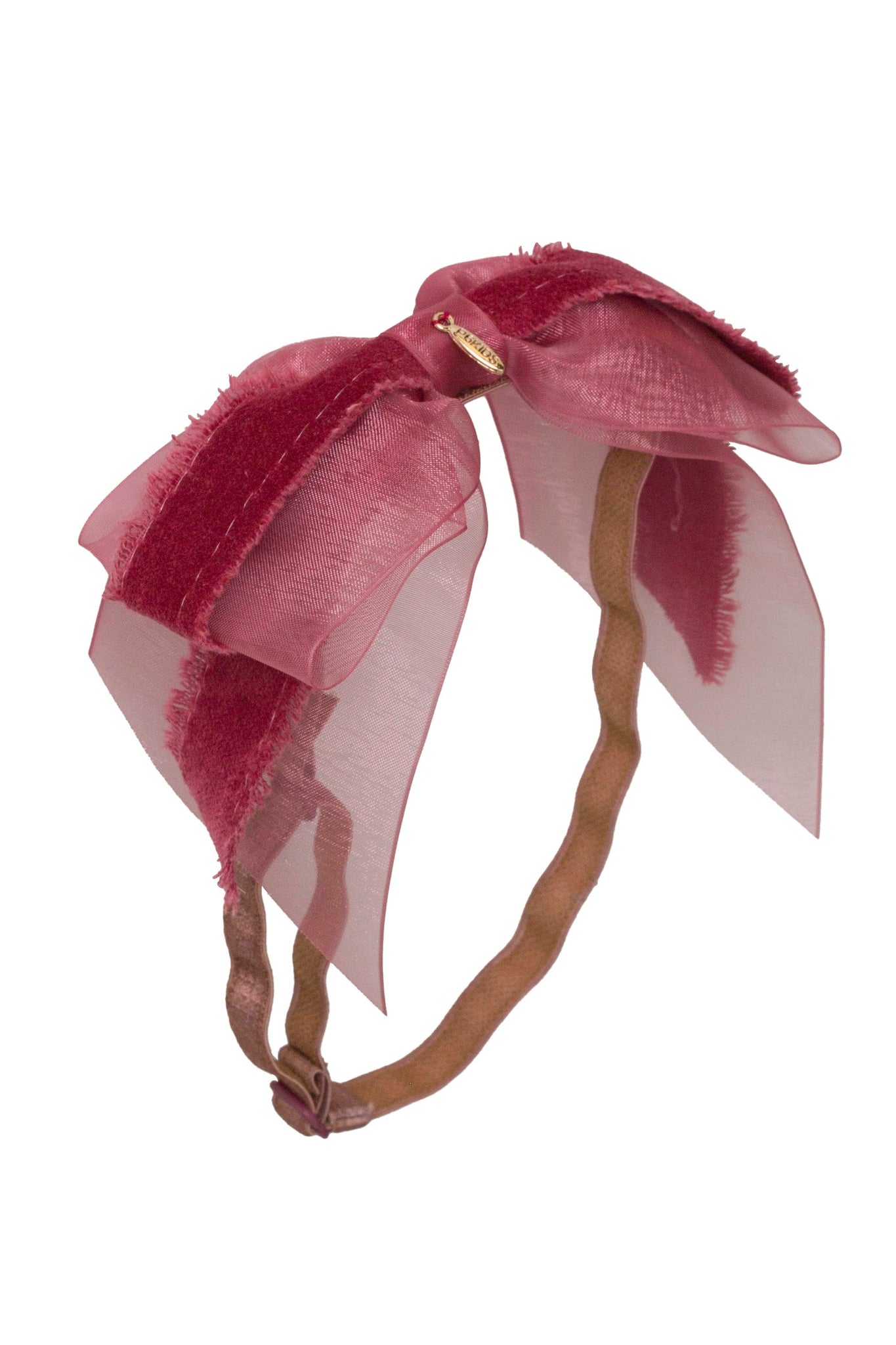 A stunning bow inspired adjustable hair wrap with organza and a velvet-like material with fringe