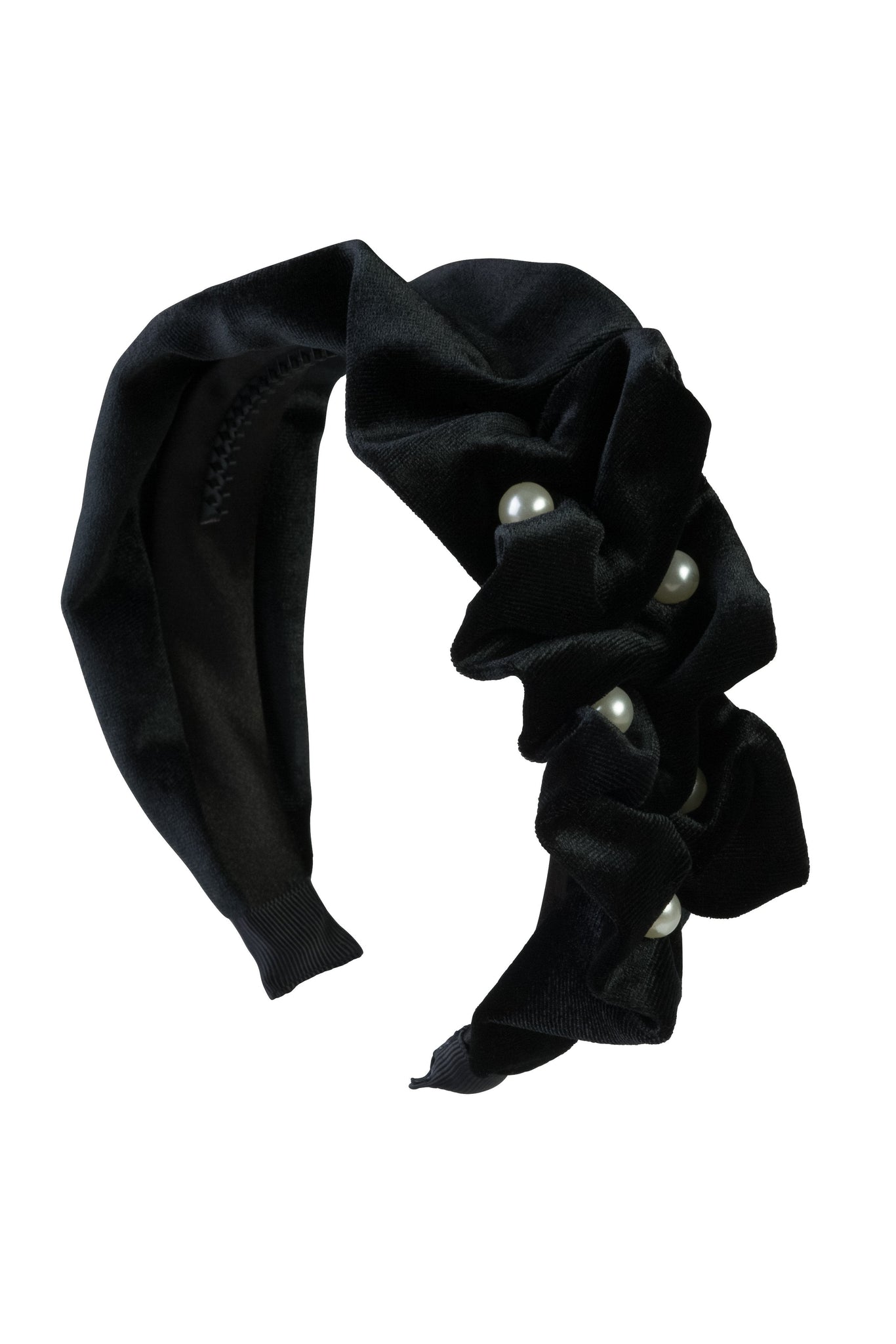 Messy pleats of velvet fabric with pearls dispersed between the pleats
